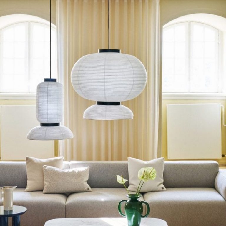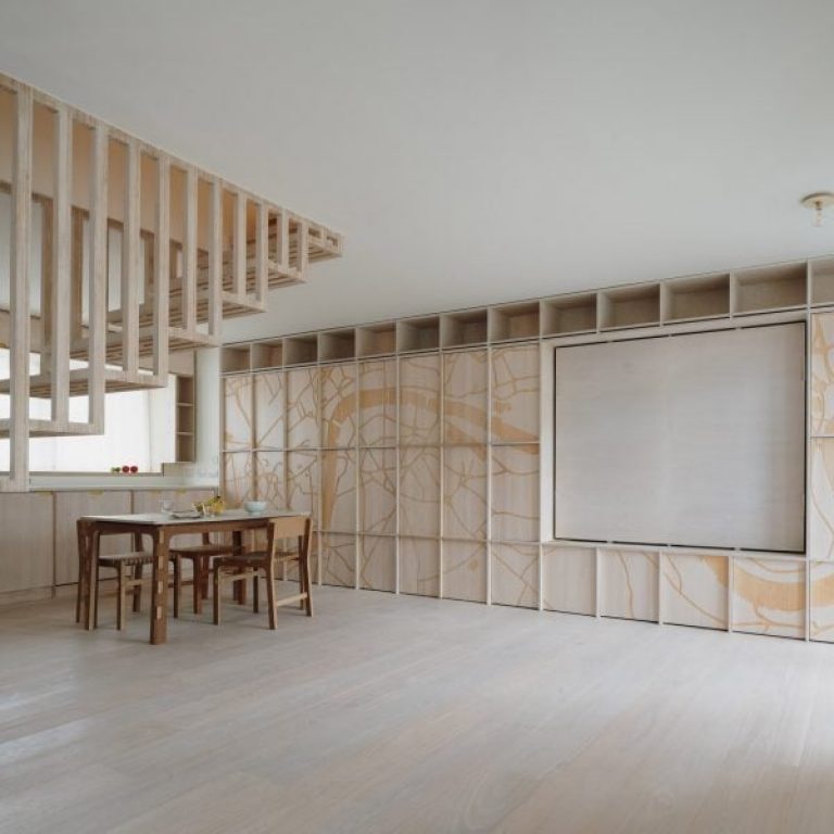 Dark blue meeting rooms surround an atrium filled with globe-shaped lights at the offices of a Minneapolis tech company, which locally based Studio BV created in a former biscuit factory. Studio BV created the 40,000-square-foot (3,700-square-metre) space for Our Family…